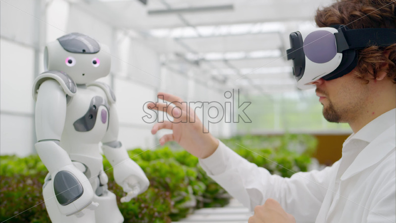 VIDEO Laboratory technician in a white coat with virtual reality headset looking around near humanoid robot in a greenhouse farm Royalty Free Stock Video Footage