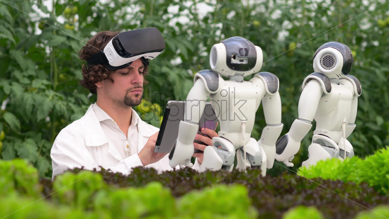 VIDEO Laboratory technician in a white coat with virtual reality headset holding a tablet while analysing two humanoid robots in a greenhouse farm Royalty Free Stock Video Footage