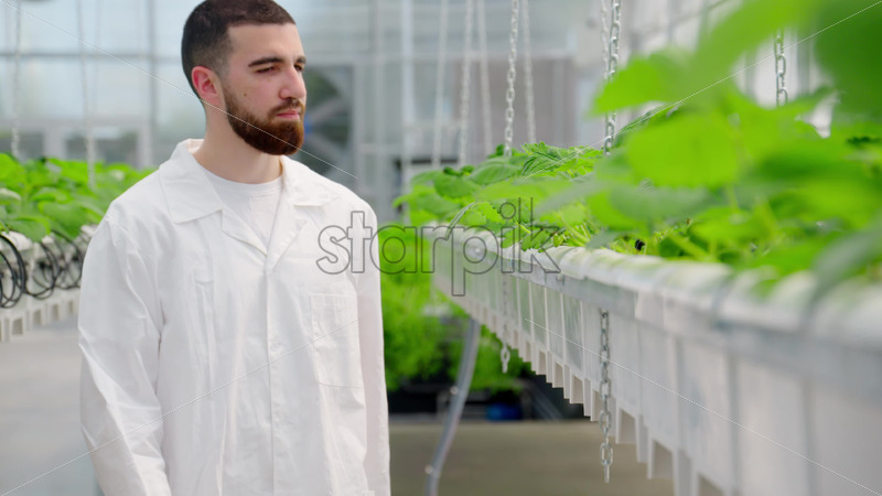VIDEO Laboratory technician in white coat analysing wild strawberry grown with the Hydroponic method in a greenhouse Royalty Free Stock Video Footage