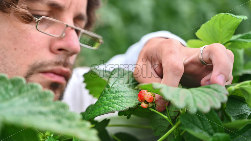 VIDEO Laboratory technician in white coat analysing wild strawberry grown with the Hydroponic method in a greenhouse Royalty Free Stock Video Footage