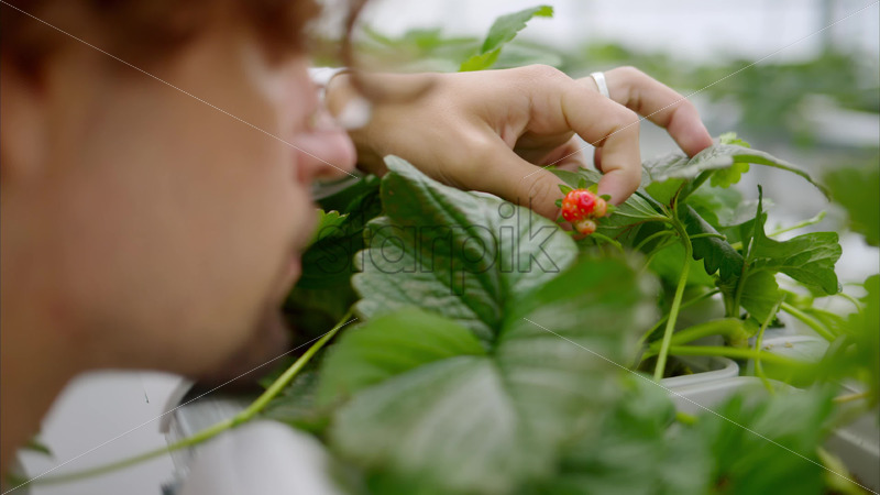 VIDEO Laboratory technician in white coat analysing wild strawberry grown with the Hydroponic method in a greenhouse Royalty Free Stock Video Footage