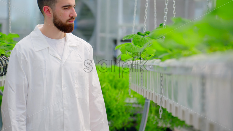 VIDEO Laboratory technician in white coat analysing wild strawberry grown with the Hydroponic method in a greenhouse Royalty Free Stock Video Footage