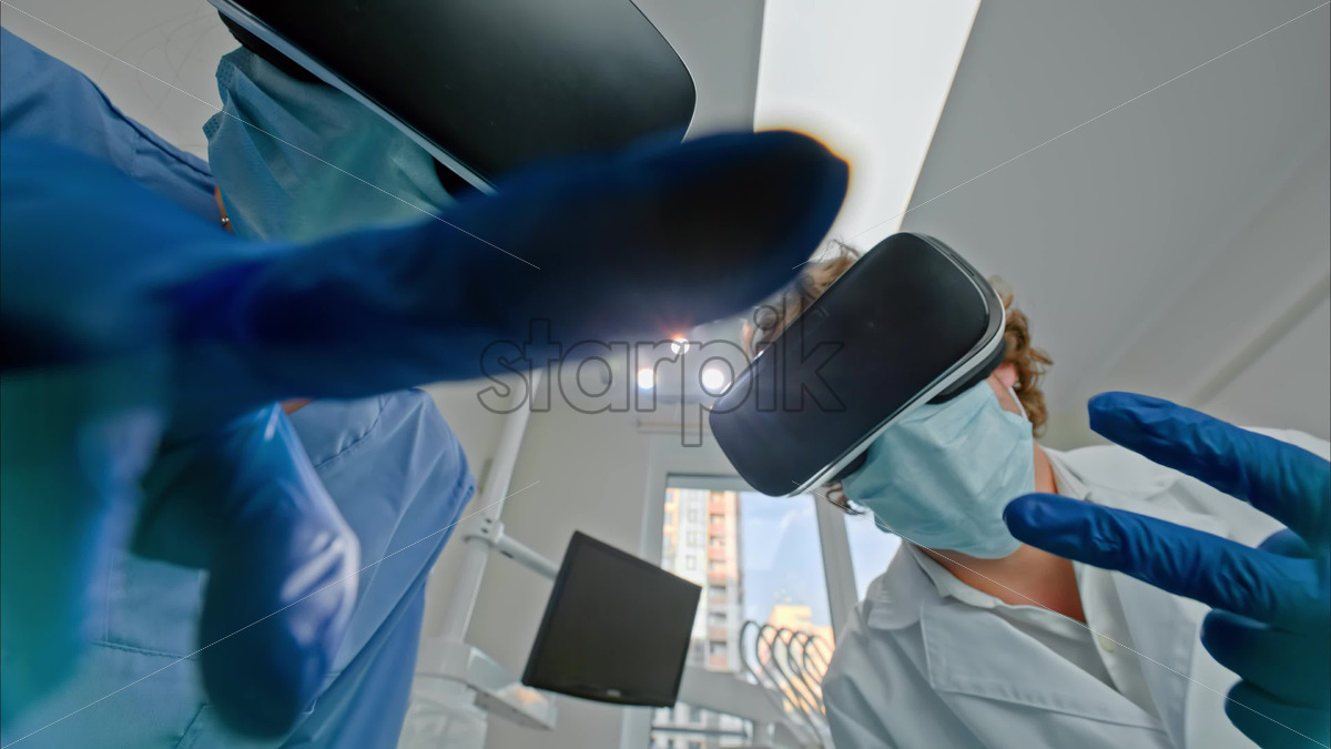 Video Low angle view of two dentists wearing protective masks, gloves and Virtual Reality headsets gesturing under bright procedural lights