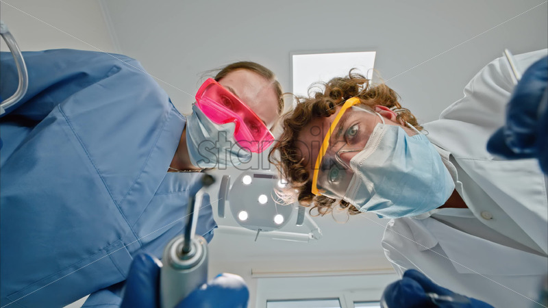Video Low angle view of two dentists wearing protective masks, goggles, and gloves, holding dental instruments under bright procedural lights Royalty Free Stock Video Footage
