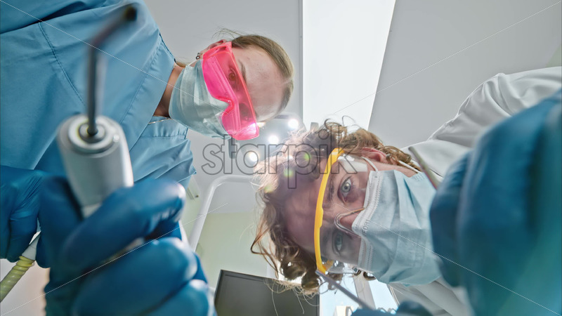 Video Low angle view of two dentists wearing protective masks, goggles, and gloves, holding dental instruments under bright procedural lights Royalty Free Stock Video Footage