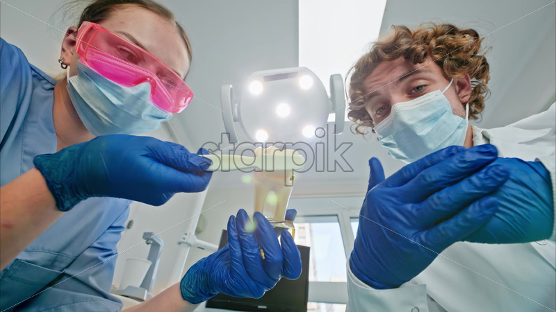 Video Low angle view of two dentists wearing protective masks, goggles, and gloves, showing a big tooth and brush figurine under bright procedural lights Royalty Free Stock Video Footage