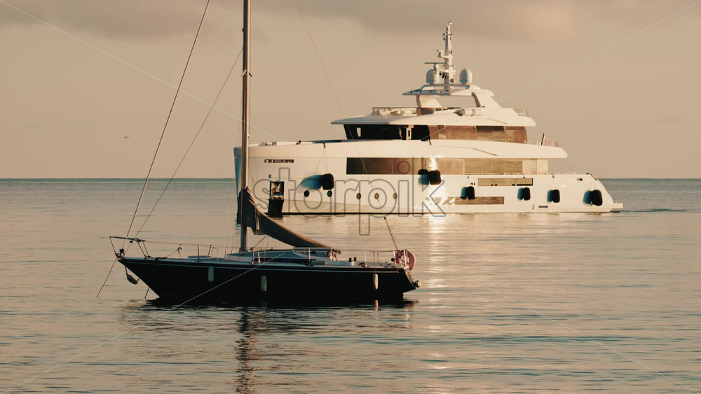 Home » Shop » 1 Video » Video – Luxury motor yacht anchored on calm Mediterranean waters near the French Riviera, with a smaller sailboat in the foreground