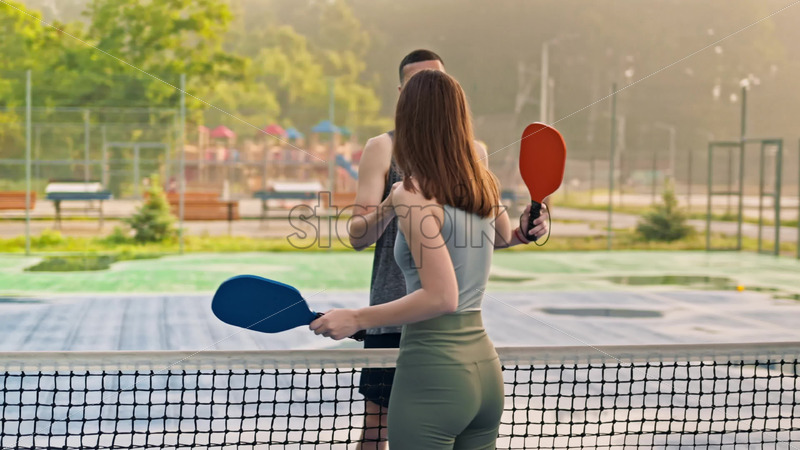 VIDEO Man and woman doing a secret handshake after playing pickleball after rain Royalty Free Stock Video Footage