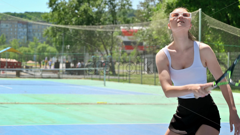 VIDEO Woman playing pickleball on a blue and green court on a sunny day Royalty Free Stock Video Footage