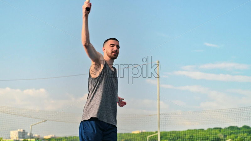 VIDEO Man playing pickleball with a red racket at sunrise, after rain Royalty Free Stock Video Footage