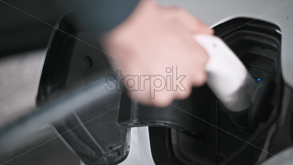 Home » Shop » 1 Video » Video – Man plugging in charger into an electric car, blue flickering light in the socket. Slow motion