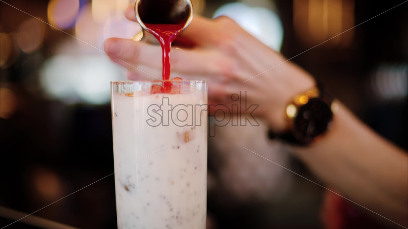 VIDEO Man pouring strawberry puree in a drink Royalty Free Stock Video Footage