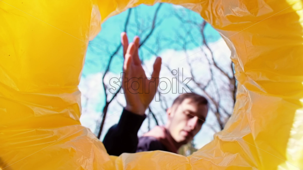 Man throwing a medical mask into a trash can. View from inside the can. Slow motion Royalty Free Stock Video Footage