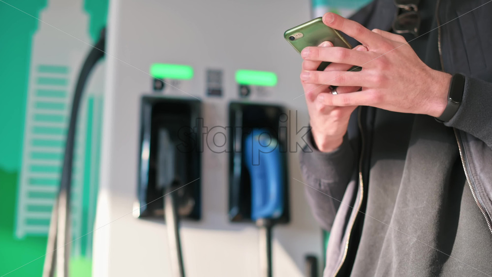 A young man using smartphone at a car charging station with charging electric car nearby. Chisinau, Moldova. Slow motion Download royalty free stock video footage Royalty Free Stock Video Footage