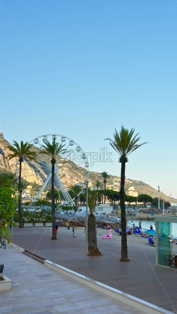 Menton, France – September 4, 2024: Distant view of a white Ferris Wheel on the beach. Vertical Royalty Free Stock Video Footage