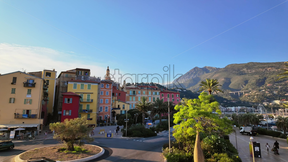 Menton, France – September 4, 2024: View of the colourful buildings in the city and people walking by the coastline Royalty Free Stock Video Footage