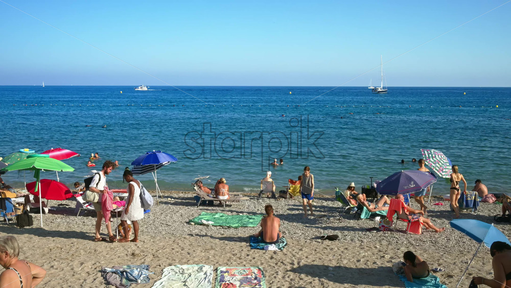 Menton, France – September 4, 2024: People swimming and relaxing on the beach under sun umbrellas Royalty Free Stock Video Footage