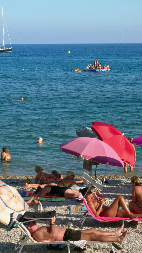 Home » Shop » 1 Video » Video – Menton, France – September 4, 2024: People swimming and relaxing on the beach under sun umbrellas. Vertical