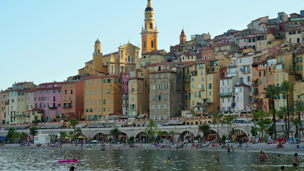 Menton, France – September 4, 2024: People swimming in the sea with a view of the colourful buildings in the city Royalty Free Stock Video Footage
