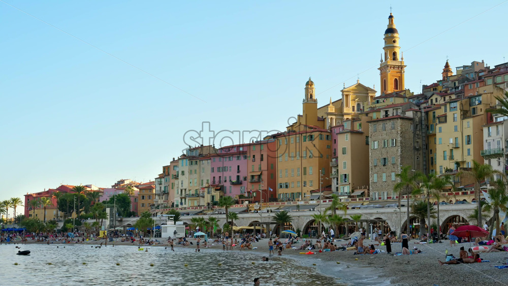 Menton, France – September 4, 2024: View of the colourful buildings in the city and people walking by the coastline Royalty Free Stock Video Footage