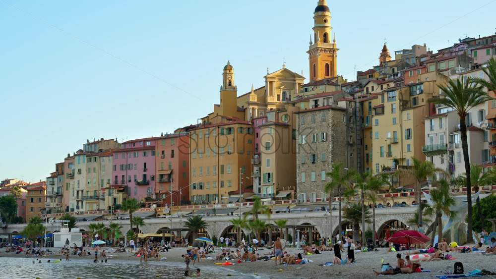 Menton, France – September 4, 2024: People swimming in the sea with a view of the colourful buildings in the city Royalty Free Stock Video Footage