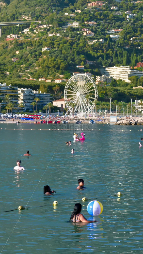 Menton, France – September 4, 2024: People swimming in the sea with a view of the colourful buildings in the city. Vertical Royalty Free Stock Video Footage