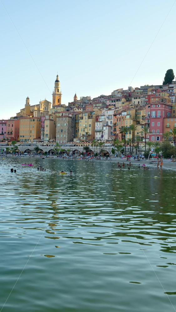 Menton, France – September 4, 2024: People swimming in the sea with a view of the colourful buildings in the city. Vertical Royalty Free Stock Video Footage