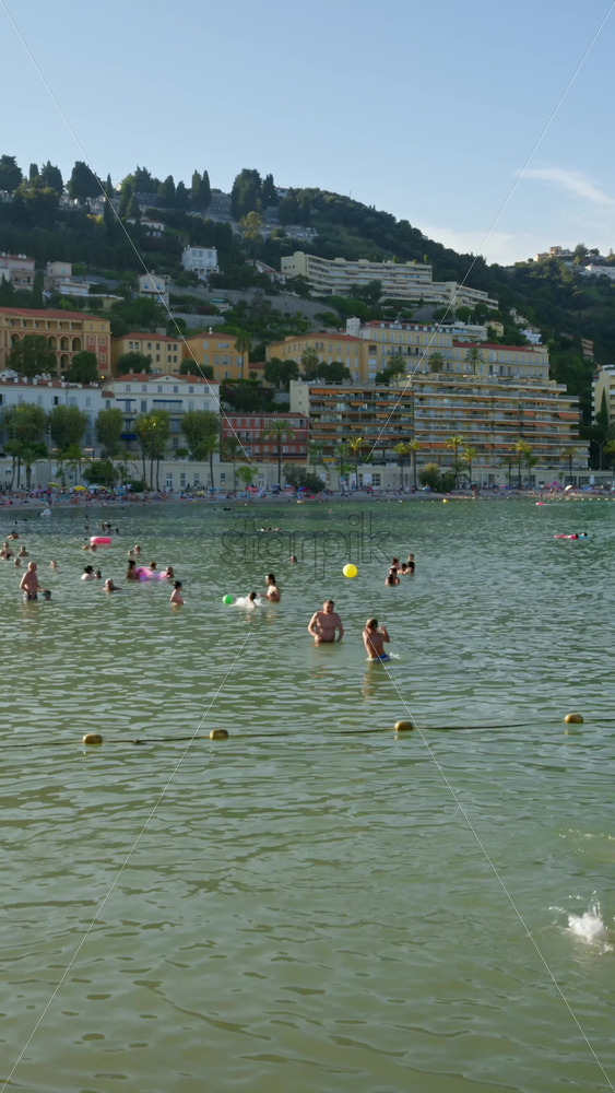 Menton, France – September 4, 2024: People swimming in the sea with a view of the colourful buildings in the city. Vertical Royalty Free Stock Video Footage