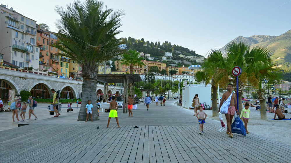 Menton, France – September 4, 2024: View of the colourful buildings in the city and people walking by the coastline. Vertical Royalty Free Stock Video Footage