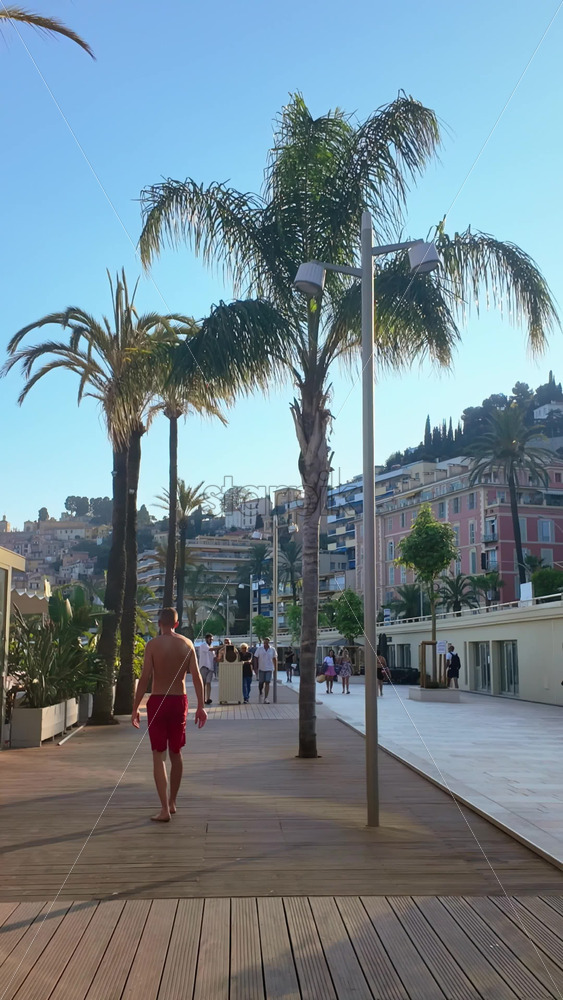 Menton, France – September 4, 2024: View of the colourful buildings in the city and people walking by the coastline. Vertical Royalty Free Stock Video Footage