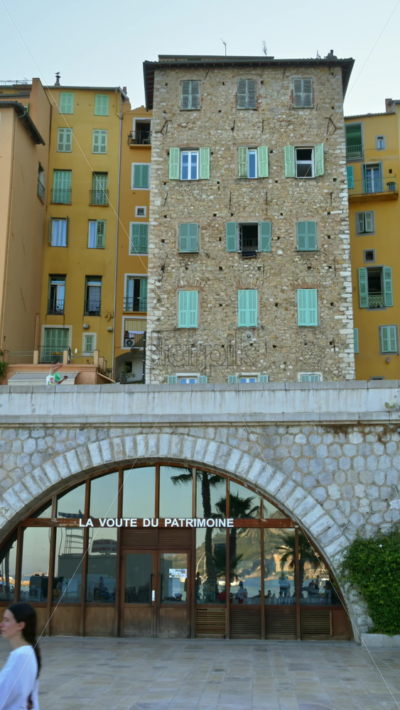 Menton, France – September 4, 2024: View of the colourful buildings in the city and people walking by the coastline. Vertical Royalty Free Stock Video Footage