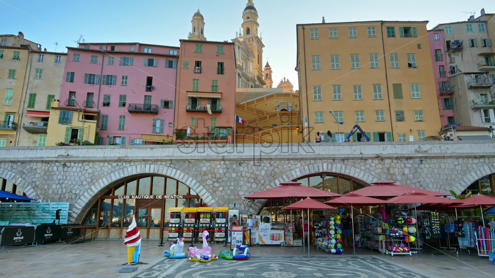 Home » Shop » 1 Video » Video – Menton, France – September 4, 2024: View of the colourful buildings in the city and people walking by the coastline