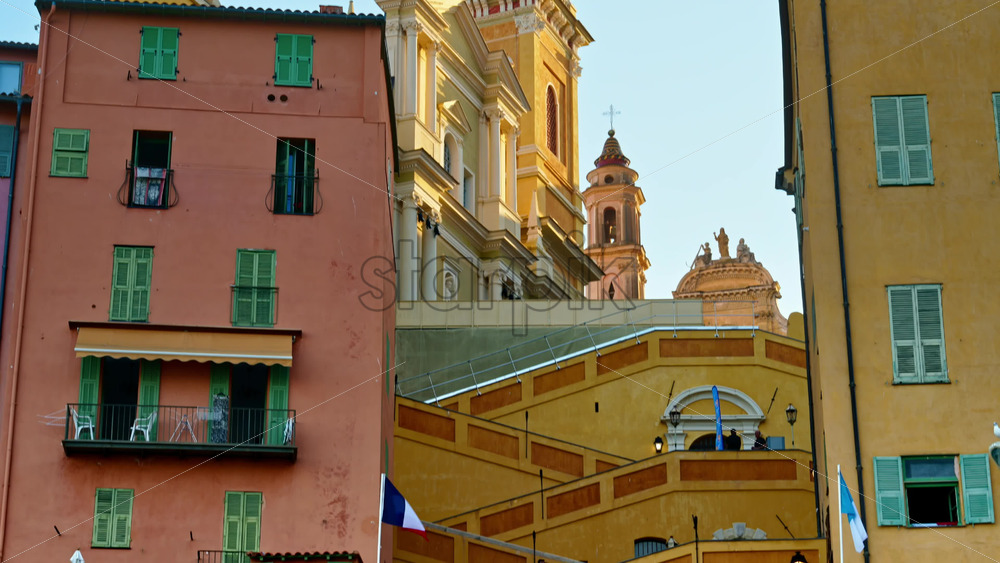 Menton, France – September 4, 2024: View of the St Michel Basilica surrounded by colourful buildings Royalty Free Stock Video Footage