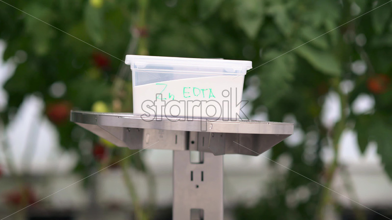 VIDEO Mobile robotics station and laboratory technician moving near rows of tomatoes in a greenhouse farm Royalty Free Stock Video Footage