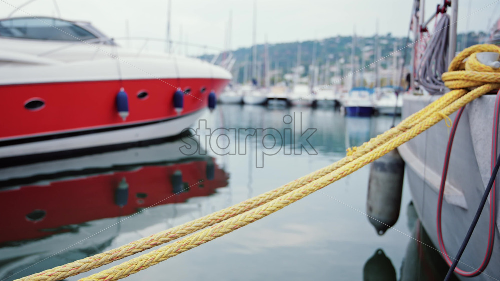 Close up of a sleek red luxury boat deck with metallic cleat, shot in bright sunlight at a marina Royalty Free Stock Video Footage