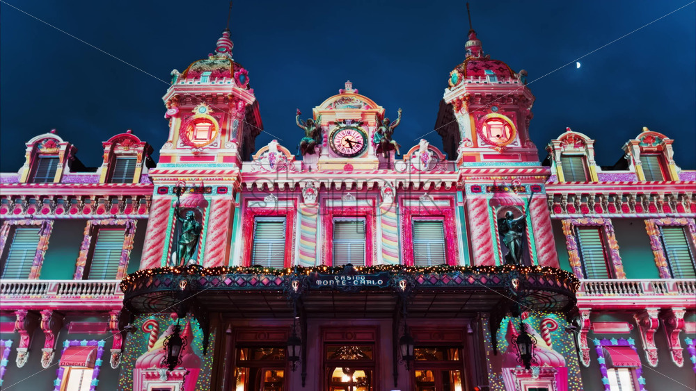 Video Monte Carlo, Monaco – December 14, 2024: Front view of the Monte Carlo Casino decorated for Christmas in the evening