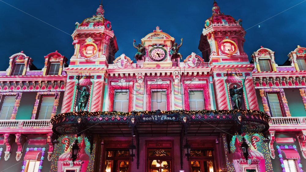 Video Monte Carlo, Monaco – December 14, 2024: Front view of the Monte Carlo Casino decorated for Christmas in the evening Royalty Free Stock Video Footage