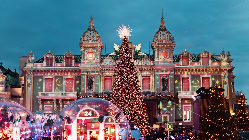 Video Monte Carlo, Monaco – December 14, 2024: Front view of the Monte Carlo Casino decorated for Christmas in the evening Royalty Free Stock Video Footage