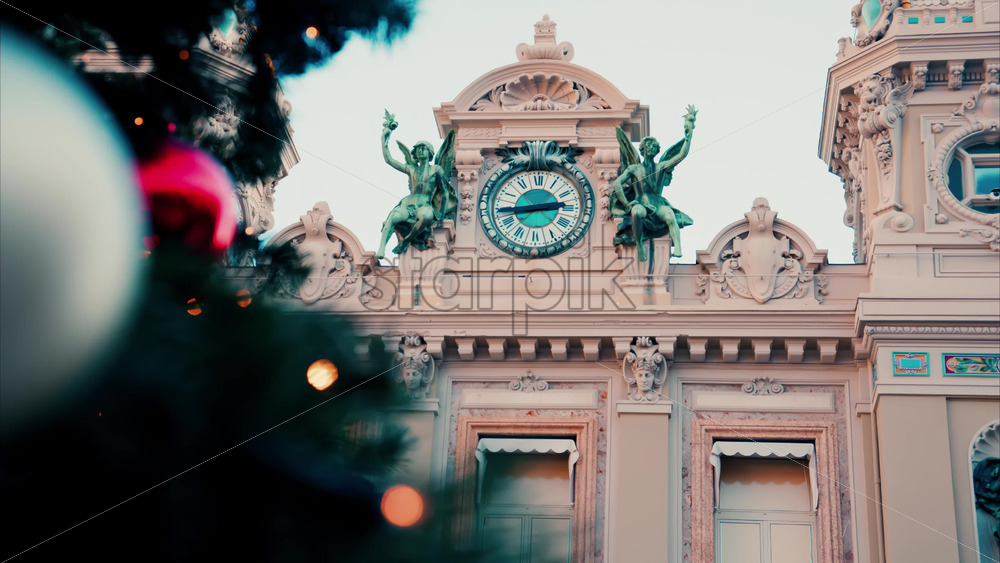 Video Close up of decorations on a Christmas tree in front of the Monte Carlo Casino in Monaco Royalty Free Stock Video Footage