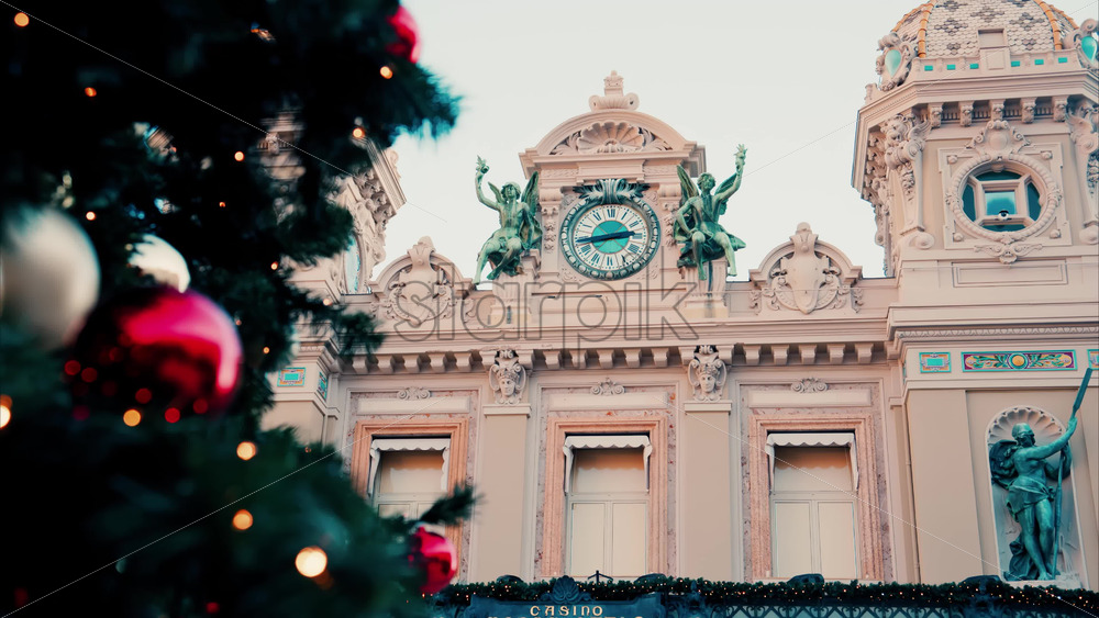 Video Close up of decorations on a Christmas tree in front of the Monte Carlo Casino in Monaco Royalty Free Stock Video Footage