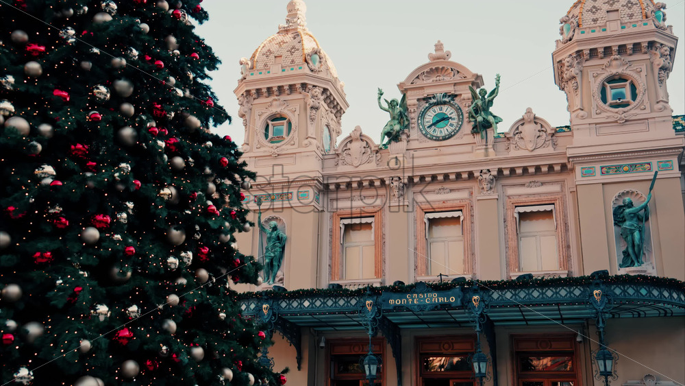 video Close up of decorations on a Christmas tree in front of the Monte Carlo Casino in Monaco in the evening Royalty Free Stock Video Footage