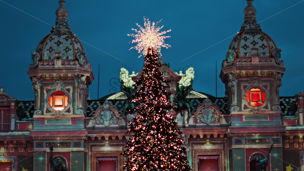 video Close up of decorations on a Christmas tree in front of the Monte Carlo Casino in Monaco in the evening Royalty Free Stock Video Footage