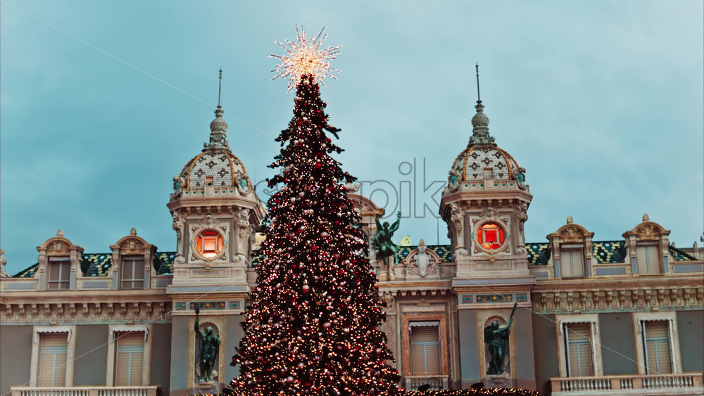 Video Monte Carlo , Monaco -December 23, 2024: Lighted Christmas tree in front of the Monte Carlo Casino