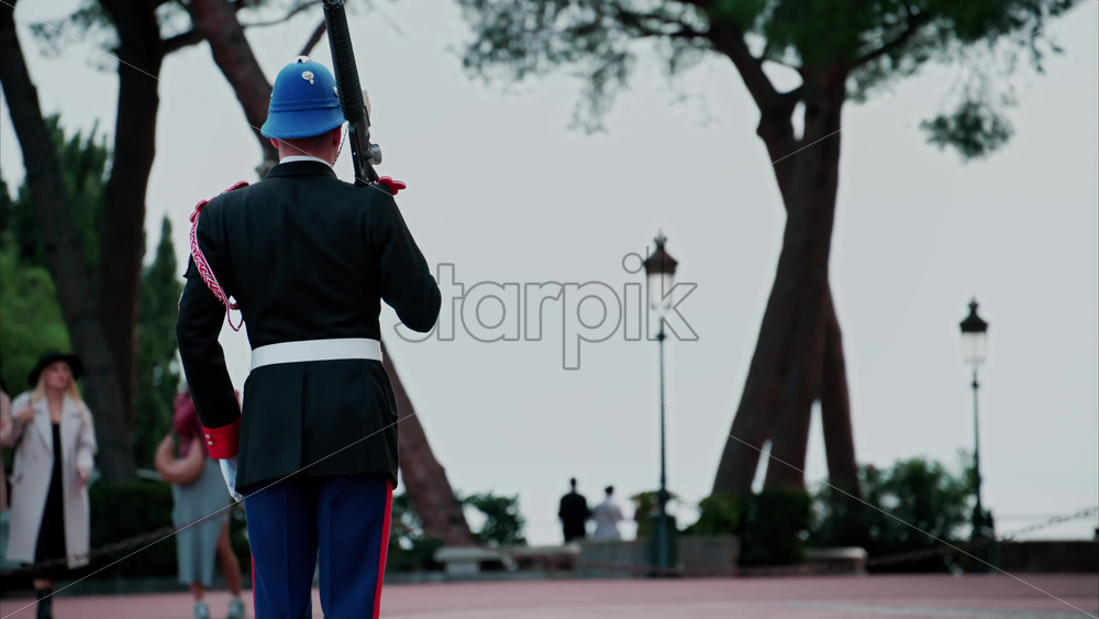 video Monte Carlo, Monaco – October 4, 2024: Guard marching at the Palace of Monaco with people moving through the court Royalty Free Stock Video Footage