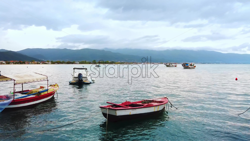 Moored boats on the shore of the Aegean sea, town and hills on the background, cloudy sky in Stavros, Greece Royalty Free Stock Video Footage