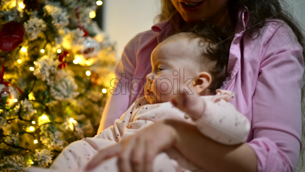 Close up portrait of a baby held by her mother during the Christmas season Royalty Free Stock Video Footage