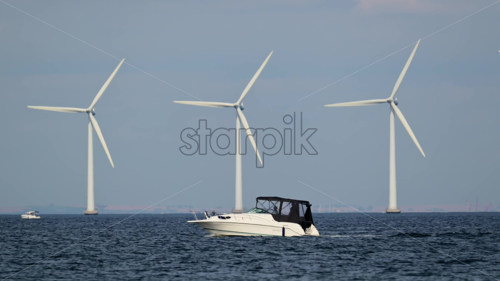 Motorboat traveling on the ocean with offshore wind turbines generating clean energy in the background. Copenhagen, Denmark Royalty Free Stock Video Footage