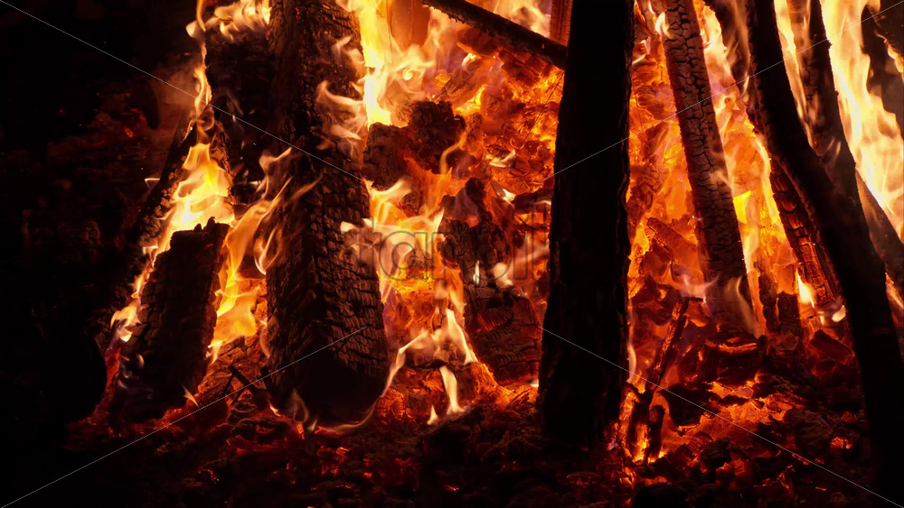 Video Close up of wood burning in a bonfire at night with a distant view of the mood on the background Royalty Free Stock Video Footage