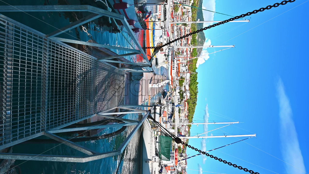 NEOS MARMARAS, GREECE – OCTOBER 8, 2020: Aegean sea port with multiple moored yachts and boats, wooden pier, town located on a hill with greenery, clear weather Royalty Free Stock Video Footage