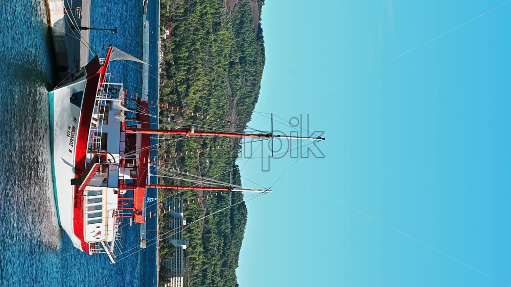 NEOS MARMARAS, GREECE – OCTOBER 8, 2020: Moored sailboat near a pier, green hill on the background. Slow motion, vertical shooting Royalty Free Stock Video Footage